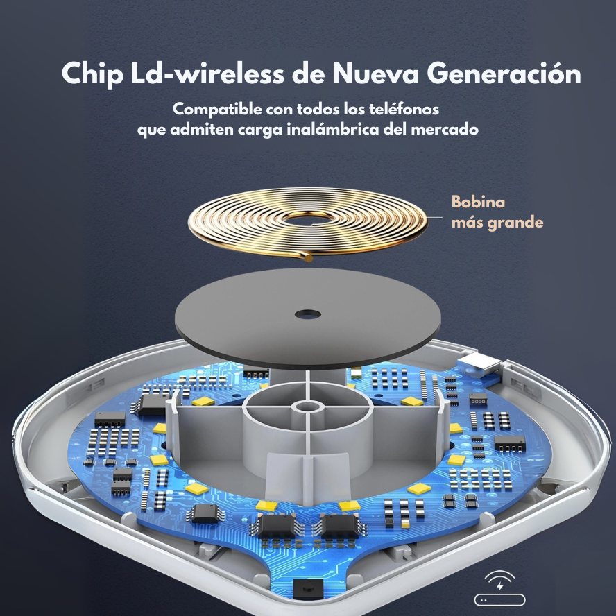 Energía eficiente y sin cables. Carga tu celular sin preocuparte de enchufes ni conectores, y con total compatibilidad universal (Android e iPhone).