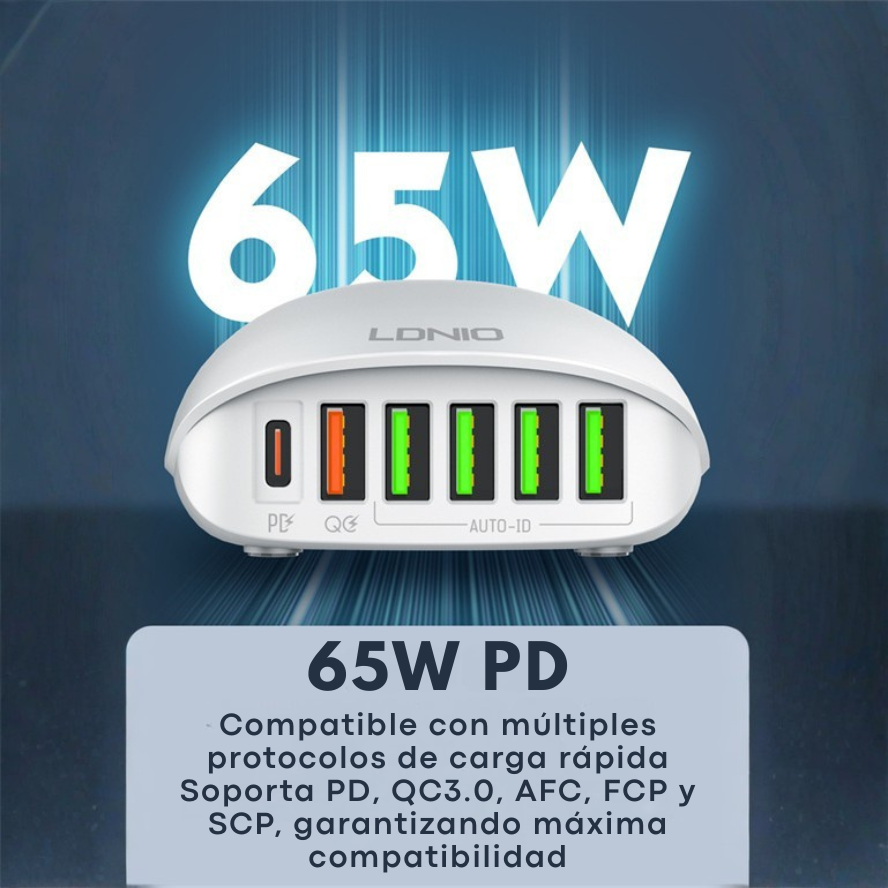 Con 6 puertos USB (1 USB-C PD + 1 QC3.0 + 4 Auto-ID) y hasta 65W de potencia, permite cargar laptops, tablets, smartphones y accesorios simultáneamente desde un solo cargador compacto.
